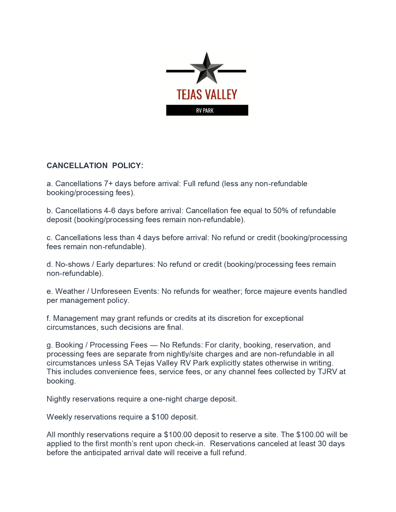Tejas Valley RV Park Rates and Policies